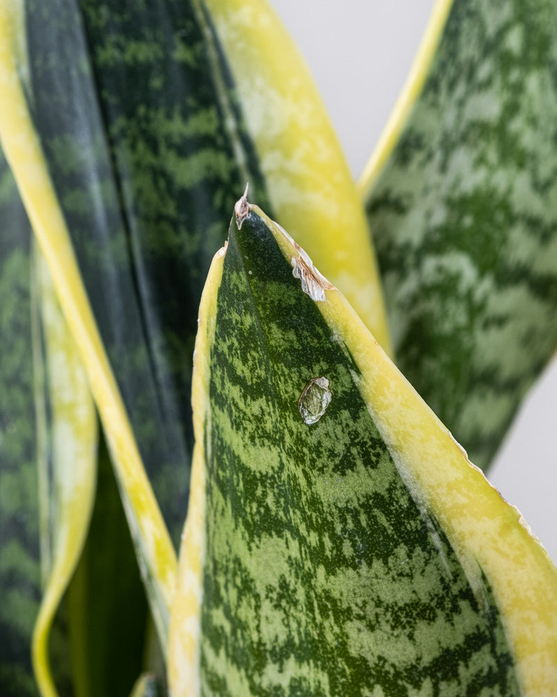 Eine Nahaufnahme der Schwiegermutterzunge mit dunkelgrünen Blättern, die aufwendig gemustert und hellgrün marmoriert sind. Einige Blätter sind gelb umrandet, was einen lebhaften Kontrast zur Pflanze bildet. Der Hintergrund hat einen sanften, neutralen Ton.