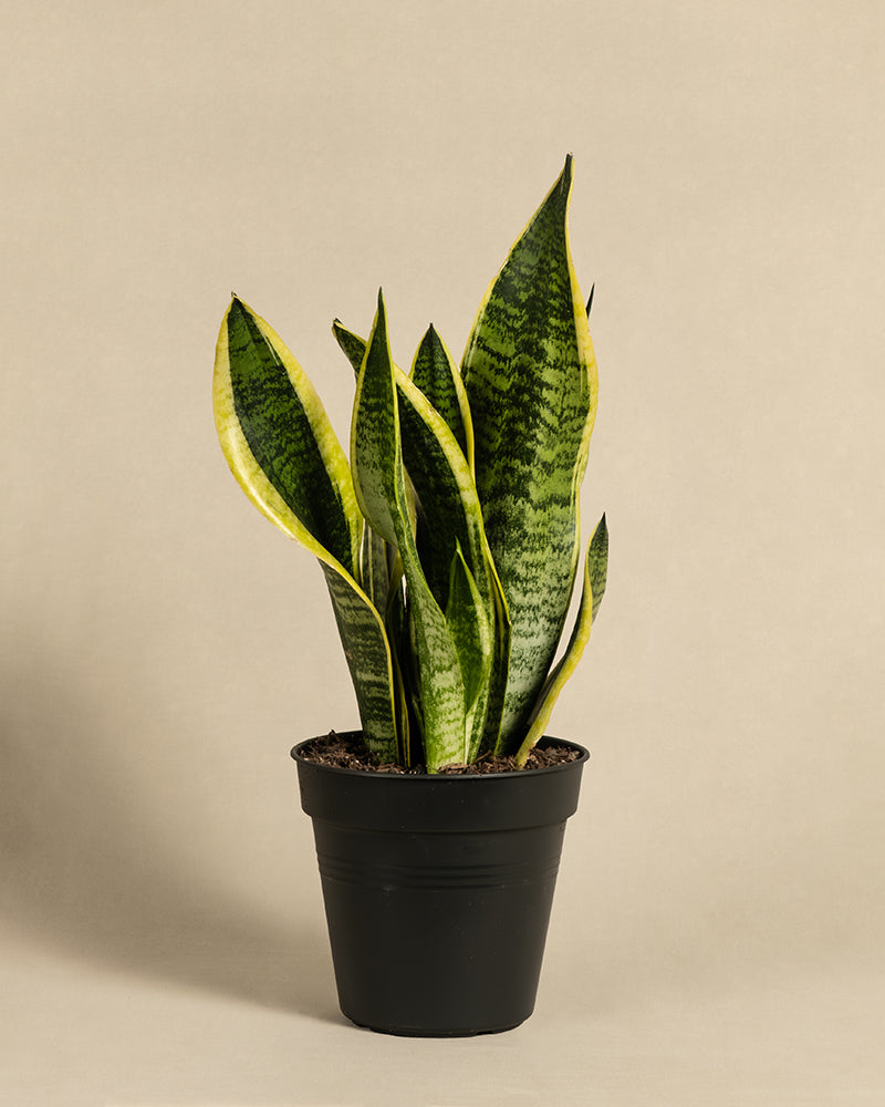 Eine eingetopfte Schwiegermutterzunge mit hohen, grünen Blättern mit gelben Rändern in einem beige- und zartrosa Keramiktopf. Die Schlangenpflanze steht vor einem schlichten, hellbeigen Hintergrund.