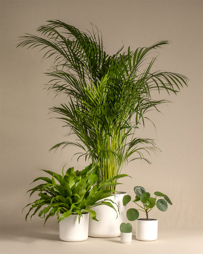 Alle drei Pflanzen in diesem Set sind sehr pflegeleicht. Wir geben dir aber die passenden Spickzettel mit, damit keine Frage zur Pflege der Goldfruchtpalme, des Nestfarns und der Ufopflanze offen bleibt.