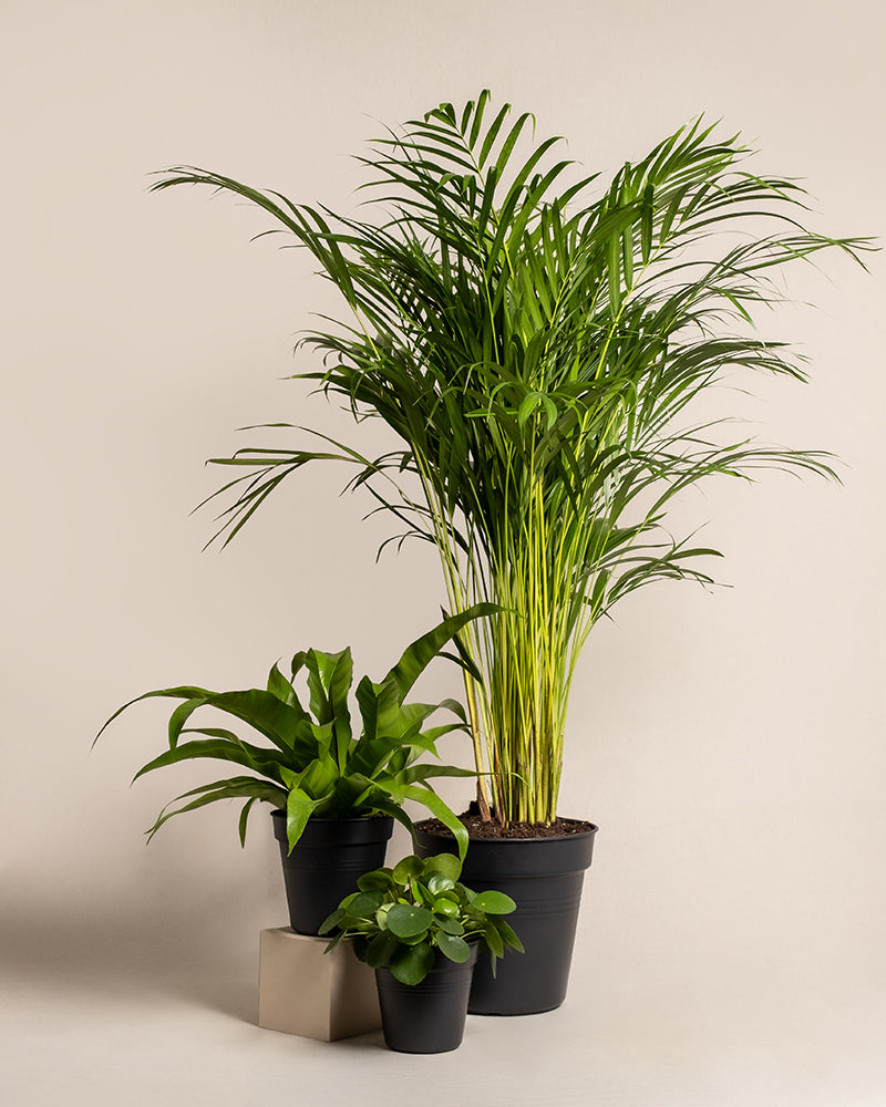 Die Goldfruchtpalme und die Ufopflanze kannst du zusammen an einen hellen oder halbschattigen Standort stellen. Nur der Nestfarn steht lieber halbschattig bis schattig.