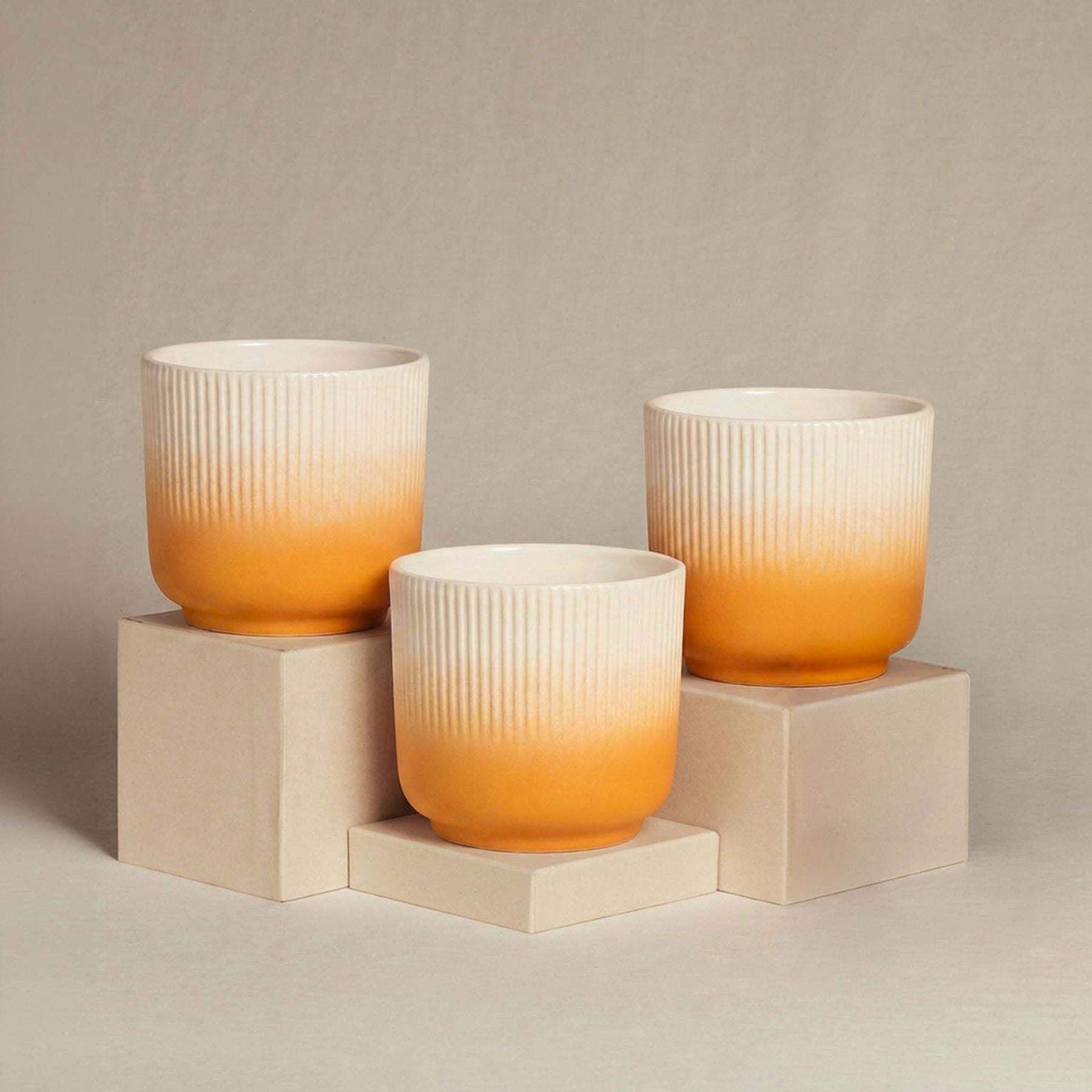 Fehlt dir noch etwas Farbe für deine Zimmerpflanzen? Dieses stilvolle Trio aus Keramik vereint feine Rillen, einen weichen Farbverlauf und ganz viel Charme. Jetzt warten die drei nur noch darauf, bei dir einzuziehen. 🪴✨