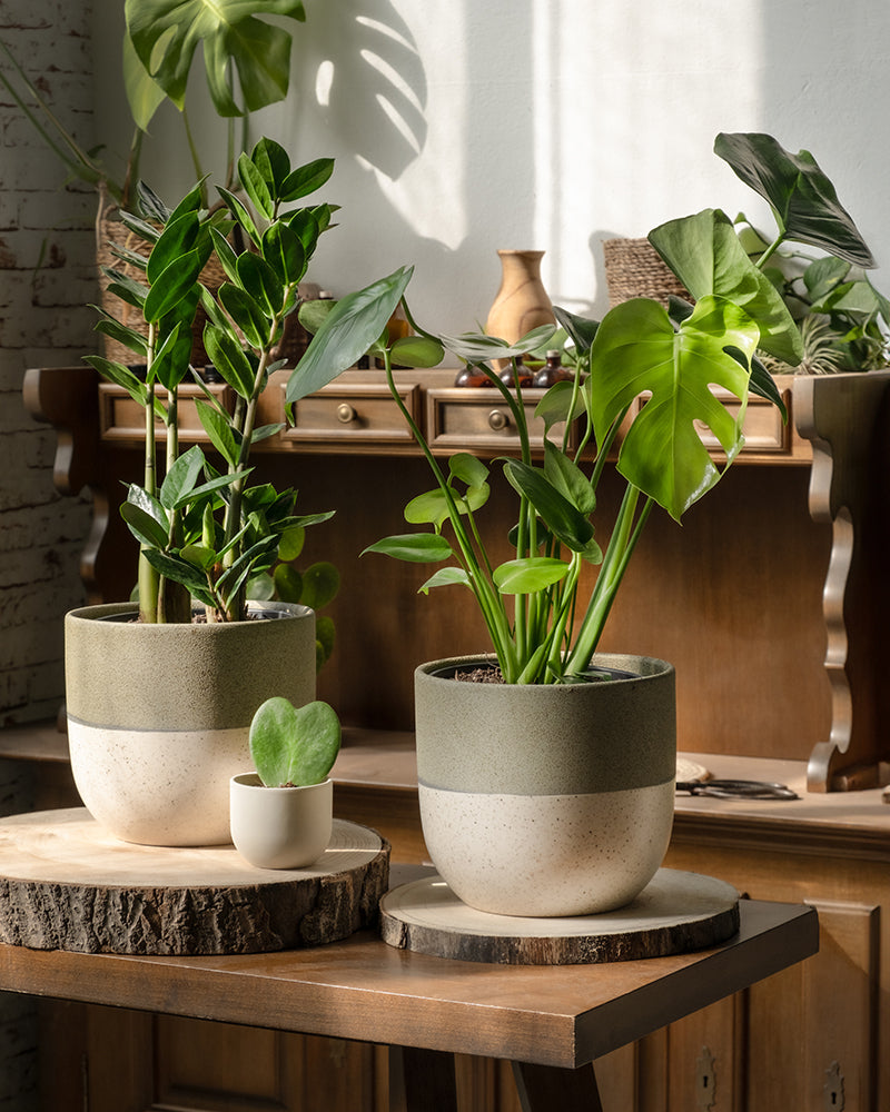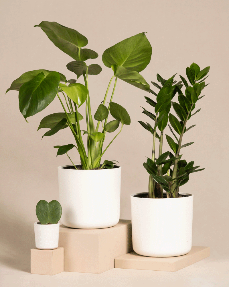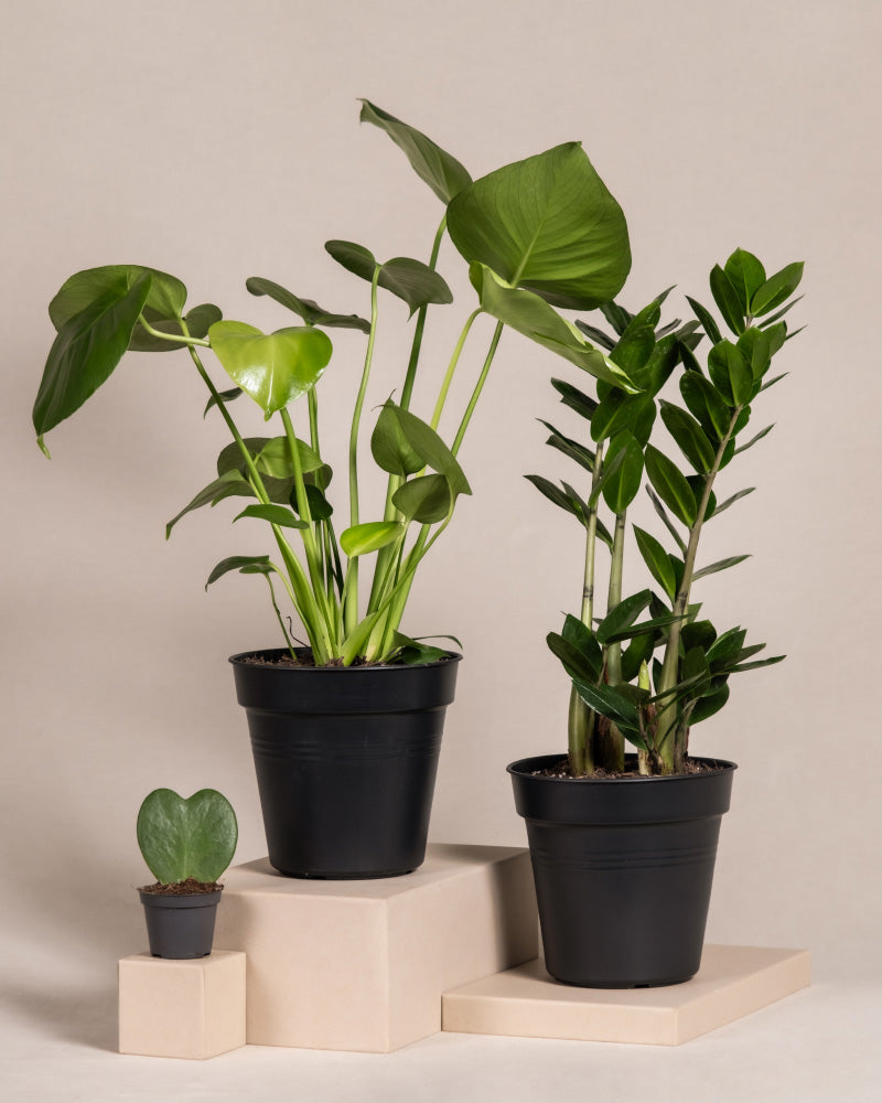 Bild, das drei Topfpflanzen des Trio Infernale in verschiedenen Größen zeigt, die auf beigen Plattformen ausgestellt sind. Die Pflanzen von links nach rechts sind: eine kleine Pflanze mit herzförmigen Blättern, eine mittelgroße Monstera mit großen, breiten Blättern und eine größere Pflanze mit dichten, aufrechten Blättern.