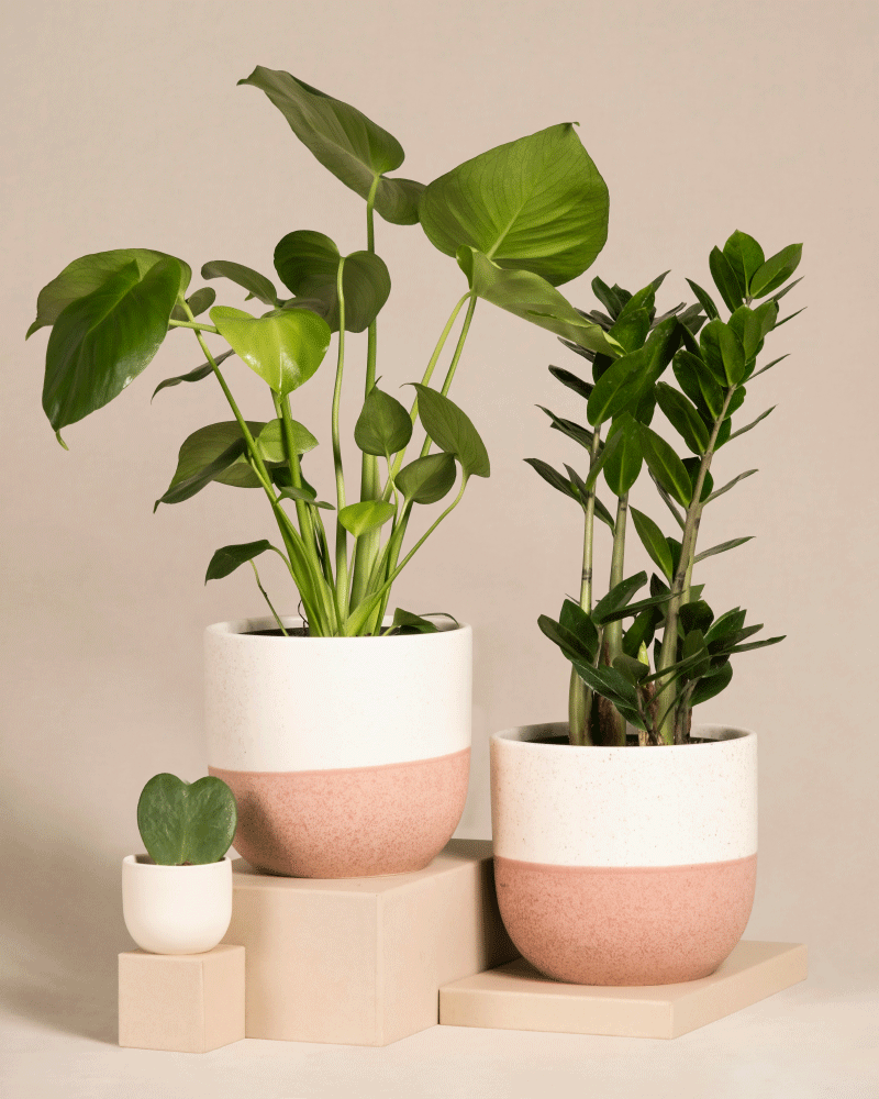 Ein minimalistisches Arrangement mit drei Topfpflanzen in weißen Töpfen. Die beiden größeren Pflanzen, eine Monstera deliciosa und eine Zamioculcas zamiifolia, stehen auf beigen Blöcken. Die Monstera hat breite, herzförmige Blätter, während die Zamioculcas schlanke, wachsartige Blätter hat. Eine kleinere Hoya kerii mit zwei herzförmigen Blättern steht in einem winzigen Topf, der zusammen Trio Infernale genannt wird.