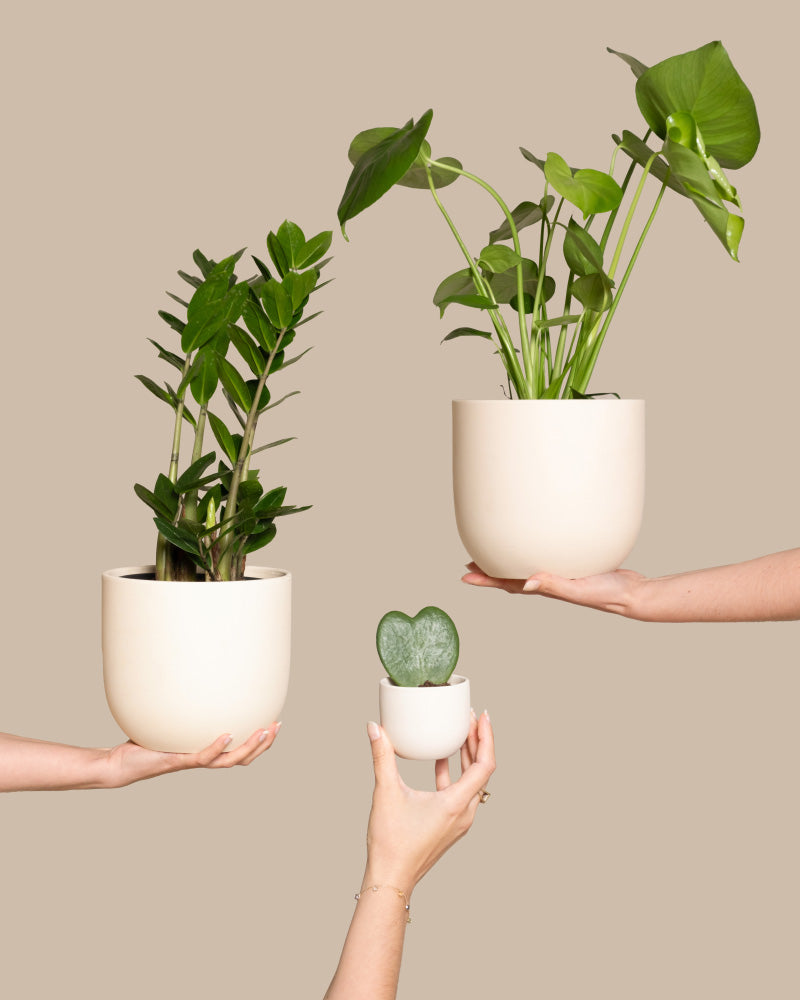 Drei Hände halten jeweils ein Trio Infernale vor einem beigen Hintergrund. Die Pflanzen sind unterschiedlich groß: eine Zamioculcas zamiifolia in einem cremefarbenen Topf, eine weitere große Pflanze in einem passenden Topf und eine kleine Hoya kerii in einem winzigen Topf. Die Szene zeigt eine trendige und minimalistische Pflanzenpräsentation.
