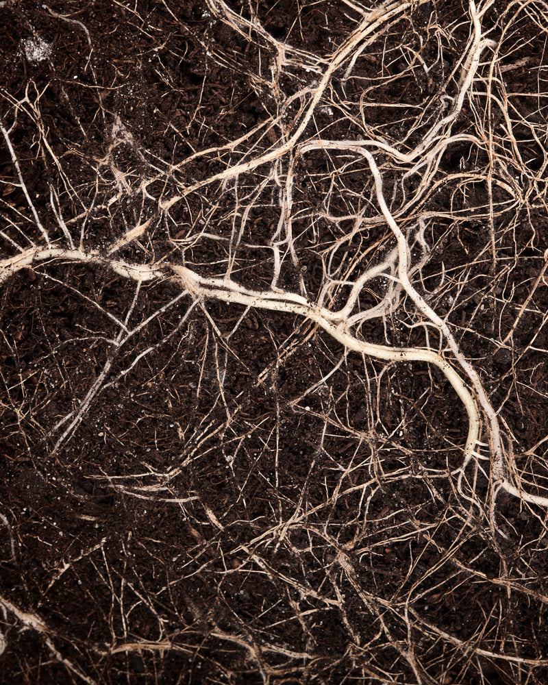 Nahaufnahme zahlreicher dünner, heller Pflanzenwurzeln, die in dunkler Erde ein dichtes Netz bilden und ein gesundes Wachstum zeigen, das durch Wurzelbooster (100 g) unterstützt wird.