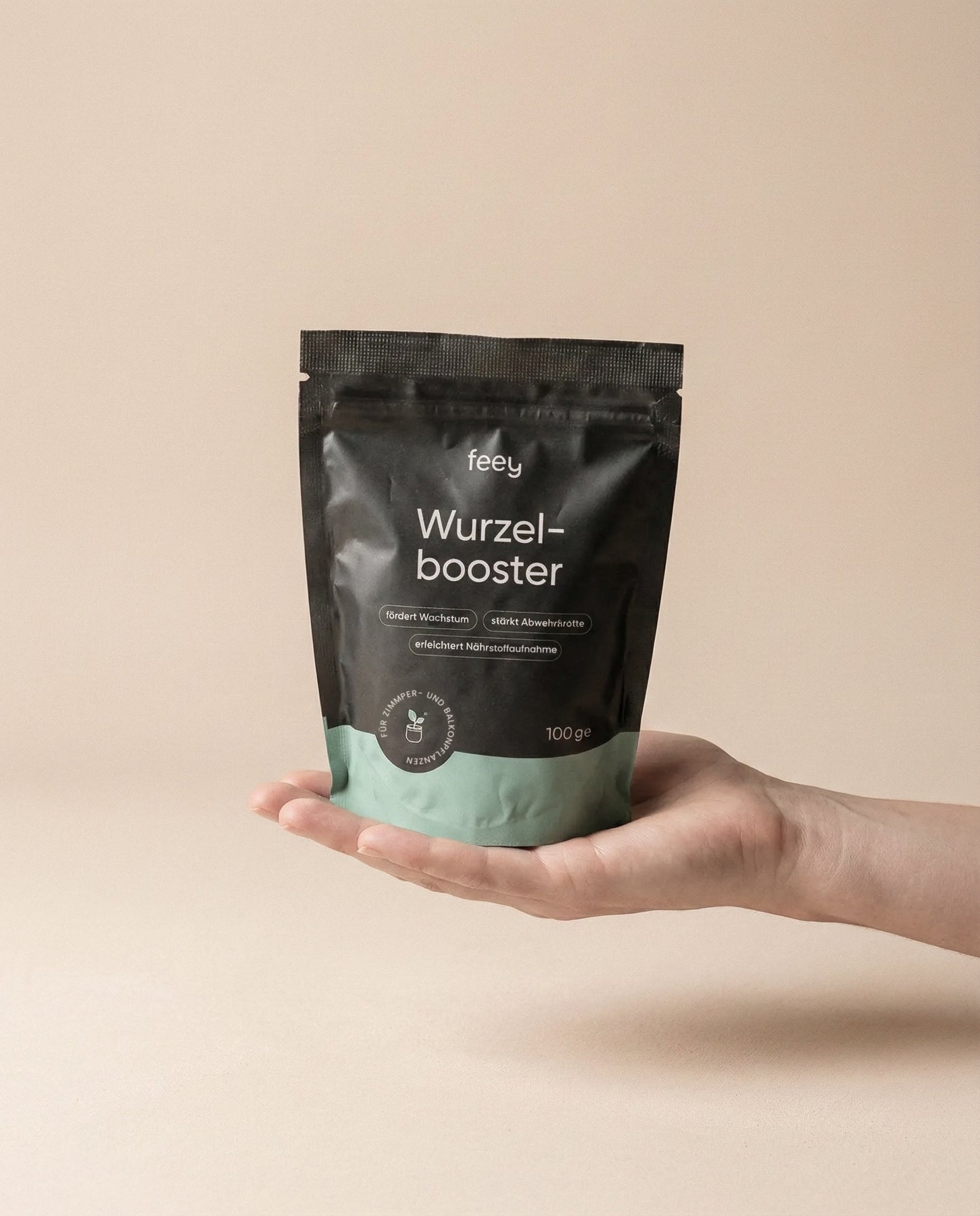 Eine Hand hält eine schwarz-grüne wiederverschließbare Tüte "Wurzelbooster (100 g)" vor einem beigen Hintergrund. Die Tüte enthält 100 g Wurzelbooster für Pflanzen.