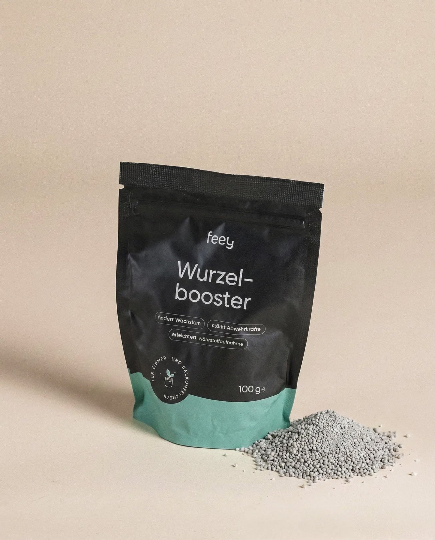 Nahaufnahme einer schwarz-grünen "Wurzelbooster (100 g)"-Verpackung mit Piktogrammen und deutschem Text, aus der hervorgeht, dass das Produkt zur Förderung des Wachstums von Zimmer- und Balkonpflanzen bestimmt ist.