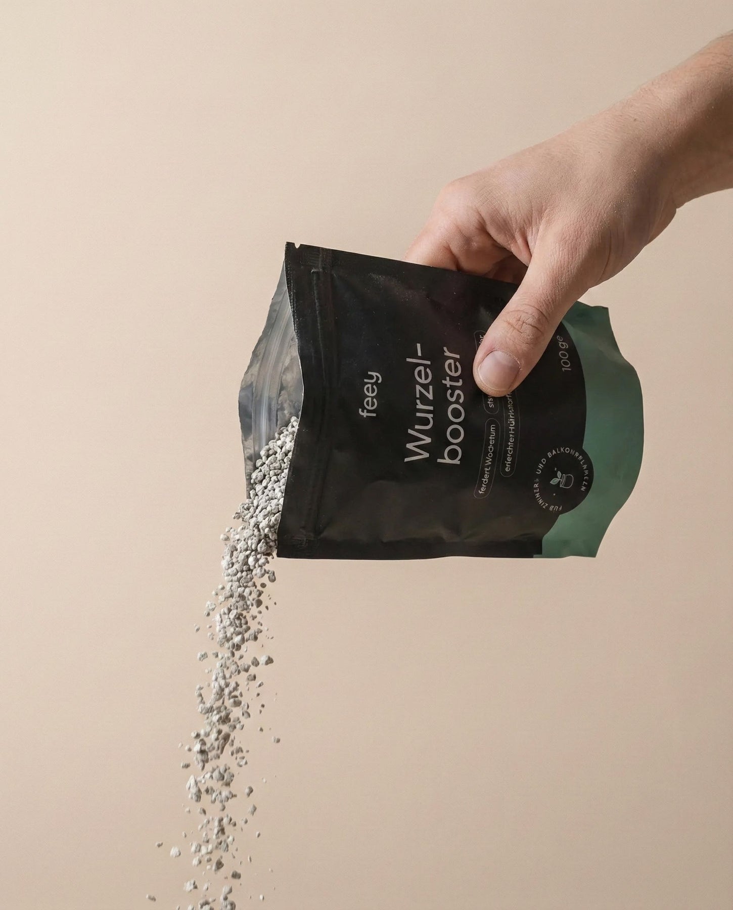 Eine Hand schüttet kleine weiße Körnchen aus einem schwarz-grünen Beutel mit der Aufschrift "Wurzelbooster (100 g)" auf einen einfarbig beigen Hintergrund.