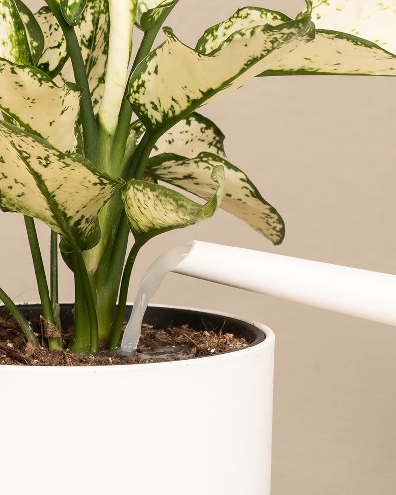 Eine Nahaufnahme von Wurzelbooster (100 g), der als weiße Gießkanne verwendet wird, gießt Wasser in die Erde einer Topfpflanze mit grün und weiß panaschierten Blättern in einem weißen Topf.